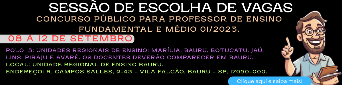 - CONVOCAÇÃO – docentes que atuam no Projeto Sala de Leitura – 02/10/2025 às 08h30 – Local: Auditório Unidade Regional de Ensino de MaríliaPortaria do Coordenador-Dirigente Regional de Ensino de Marília Substituto, de 29/09/2025. O Coordenador-Dirigente Regional de Ensino de Marília Substituto, CONVOCA os docentes que atuam no Projeto Sala de Leitura de todas as Unidades Escolares da Unidade Regional de Ensino de Marília, conforme Resolução SEDUC nº 35/2025, em atendimento ao disposto no Comunicado DAA-DMOB 05/2025, […] Leia mais »