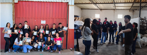 No dia oito de maio de dois mil e vinte e cinco os estudantes da 2ª série A realizaram visita técnica durante a disciplina de química, ministrada pela professora Fabiana à Fábrica de Plásticos Santa Clara, localizada no município de Oscar Bressane- SP. O objetivo desta visita foi observar na prática os conceitos discutidos de forma teórica durante as aulas como a produção de polímeros plásticos, sua utilização, descarte e riscos à saúde e ao ambiente. A fábrica realiza a produção de sacos de lixo doméstico, hospitalares e para diversas instituições públicas a partir de um processo de reciclagem, aliada ao uso de energia solar e reaproveitamento de água.
